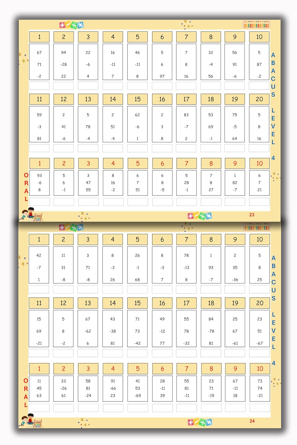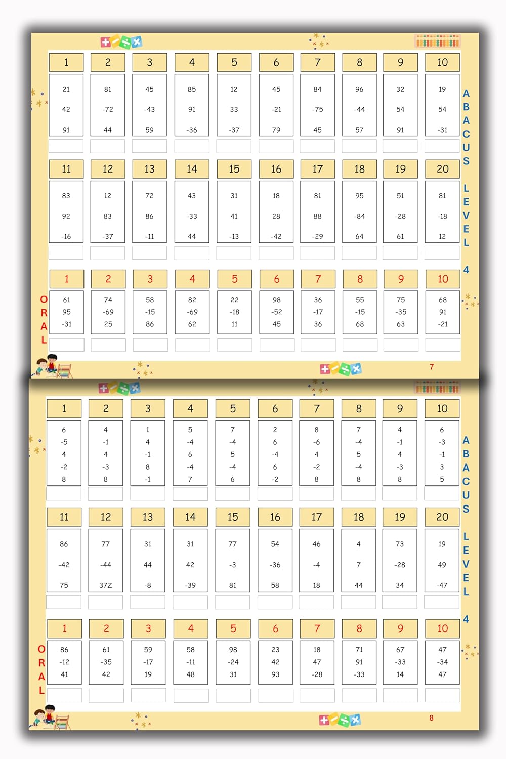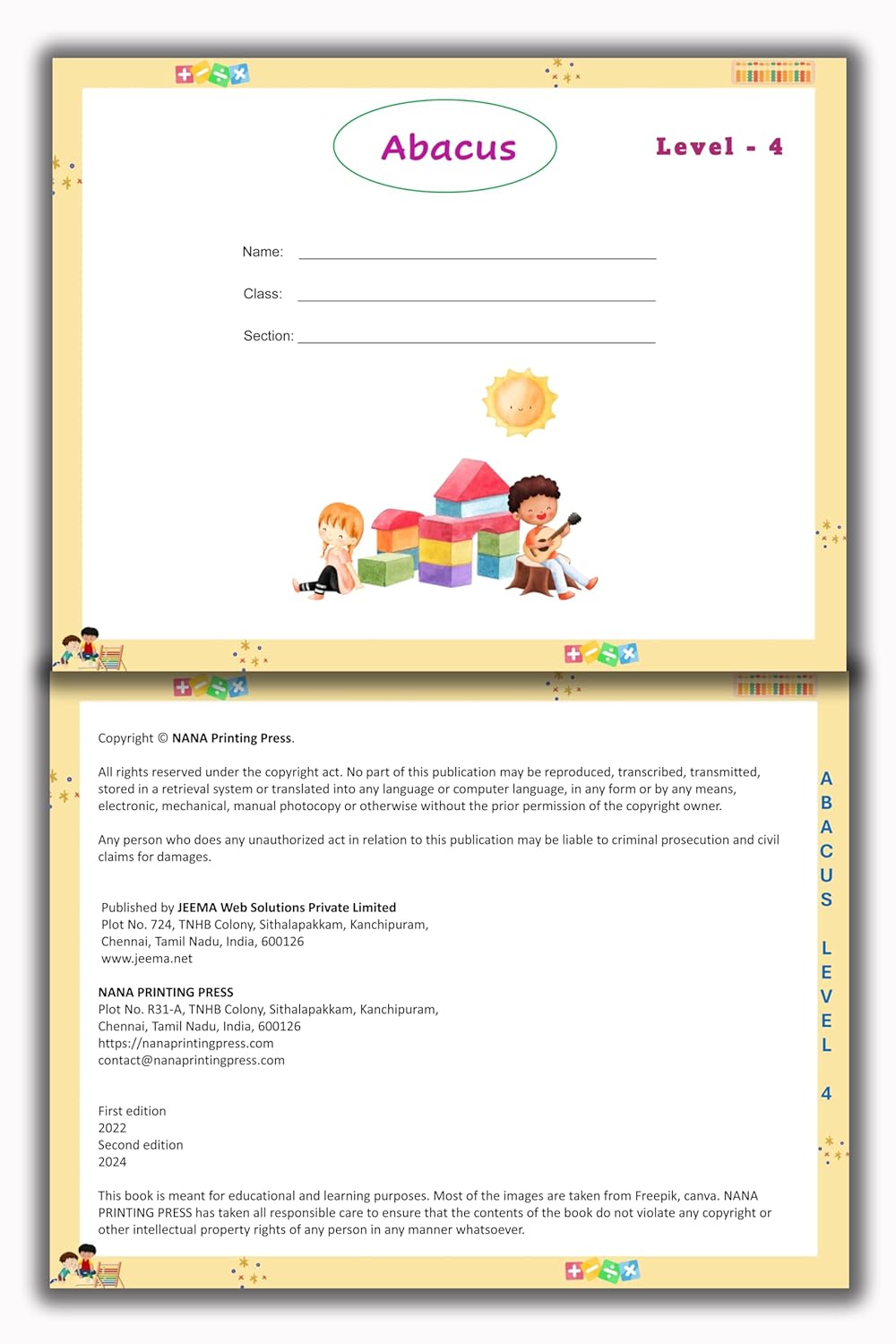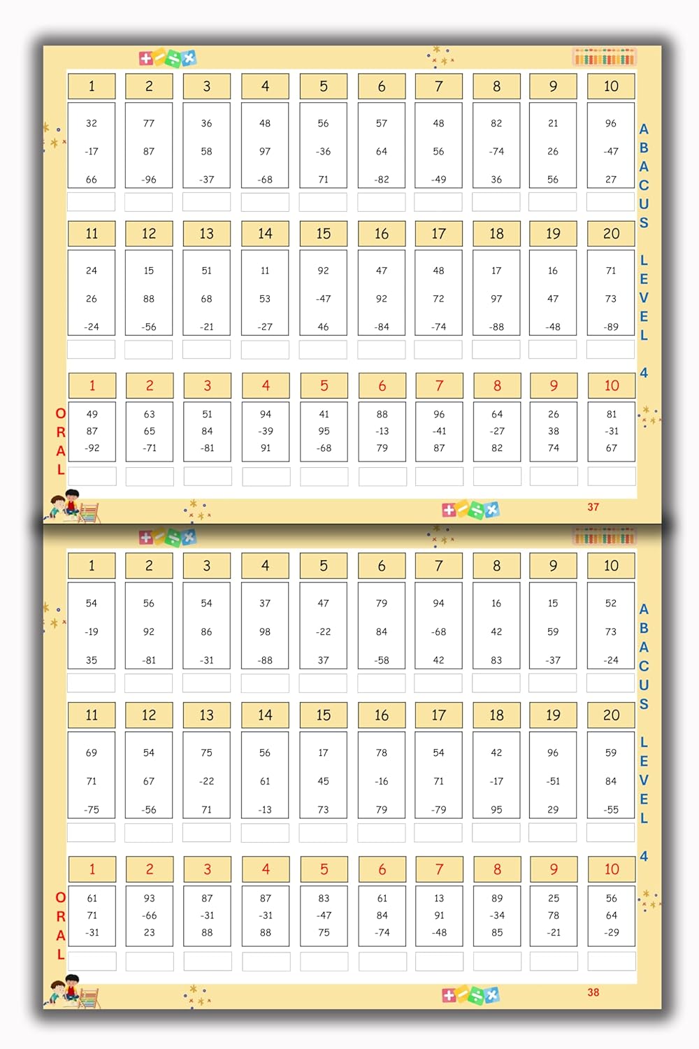 Our Abacus Level 4 Book is thoughtfully designed to enhance young learners' arithmetic skills by introducing advanced abacus techniques, fostering efficient mental calculation abilities, and deepening their understanding of mathematical concepts. The book begins by reinforcing addition and subtraction using the Multiple Formula. Building upon this foundation, the curriculum introduces the Inner Big Friends Formula and the Inner Small Friends Formula. By systematically progressing through these structured techniques, the Abacus Level 2 Book equips students with the skills necessary for swift, accurate, and flexible mental calculations, laying a solid foundation for more advanced mathematical concepts in subsequent levels.