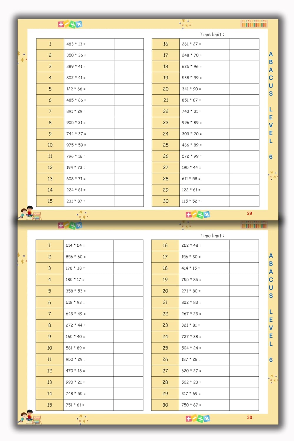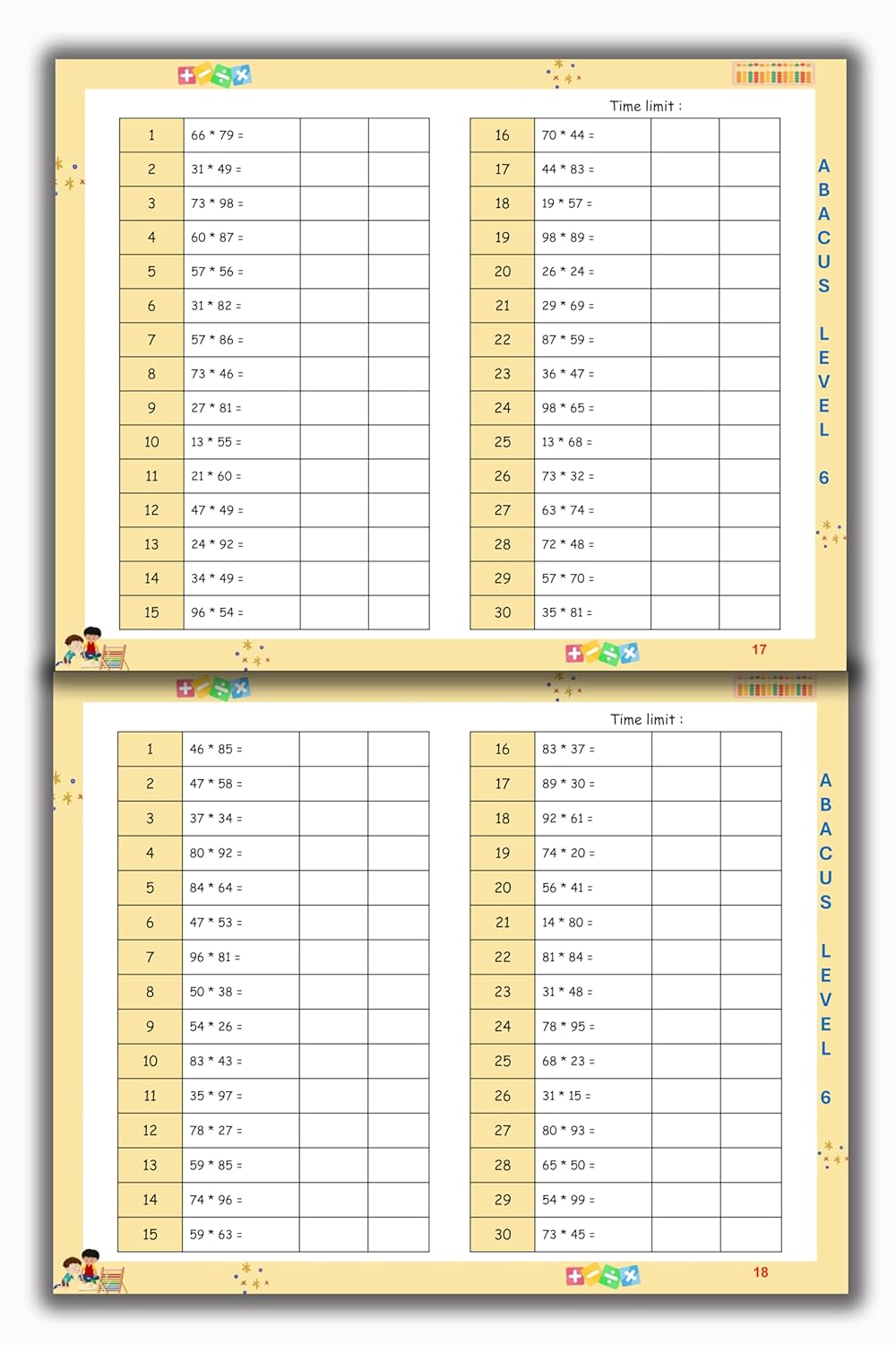 Our Abacus Level 6 Book is meticulously designed to enhance advanced arithmetic skills, focusing on multiplication techniques to bolster mental calculation abilities. This level introduces complex multiplication problems, including the multiplication of double-digit numbers by double-digit numbers, aiming to improve speed and accuracy in mathematical computations. The book offers a comprehensive approach, combining abacus methods with mental calculation strategies. It provides ample practice through a variety of sums, reinforcing the application of multiplication in diverse mathematical scenarios. By engaging with these exercises, students develop proficiency in handling more intricate calculations, building a strong foundation for higher-level mathematics.