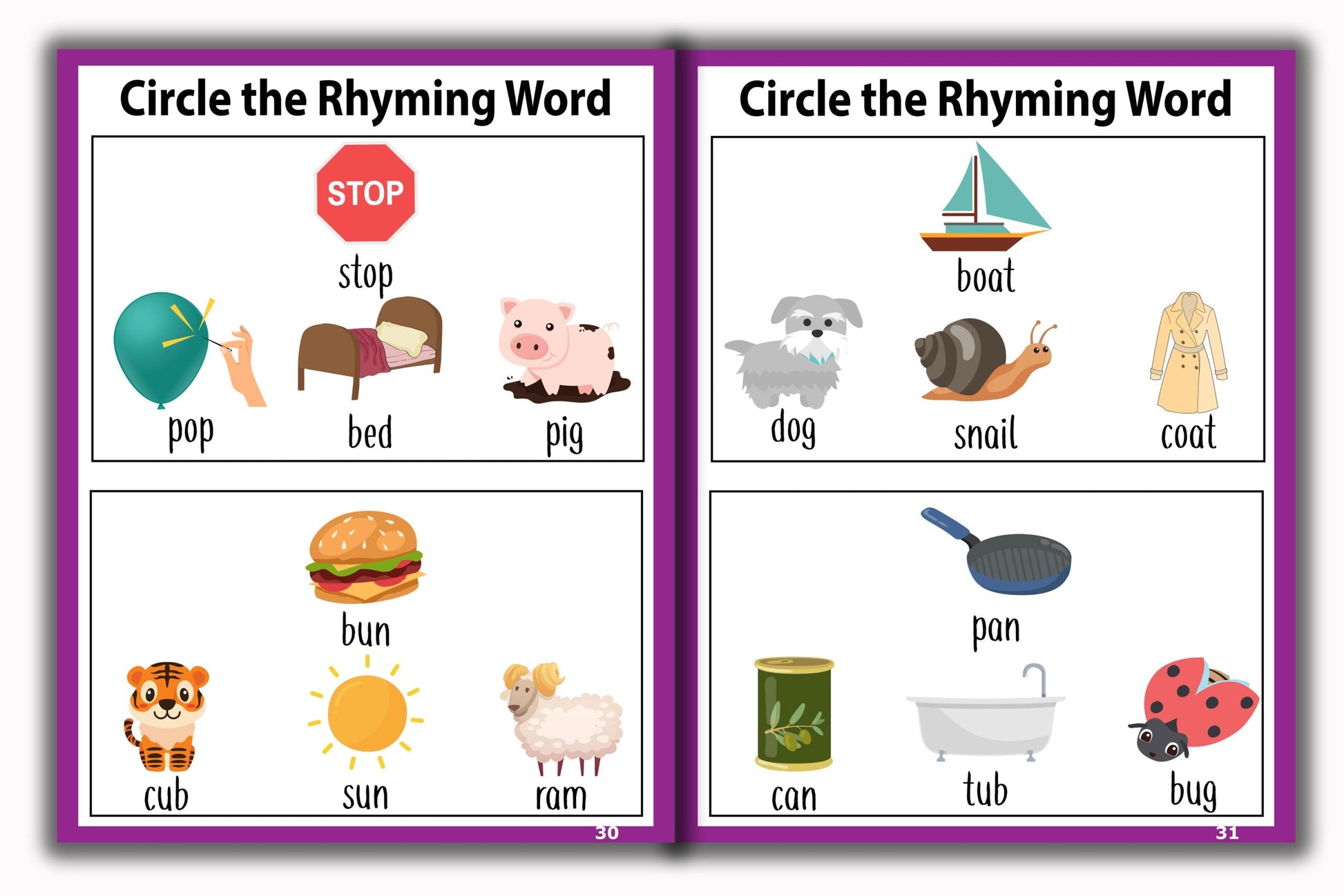 Rhyming Words: This book enhances phonemic awareness by introducing children to rhyming words. Activities include matching words that rhyme, helping children develop listening skills and vocabulary. The "Rhyming Words Flash Cards Activities Workbook" offers 200 CVC words with pictures to engage young learners.