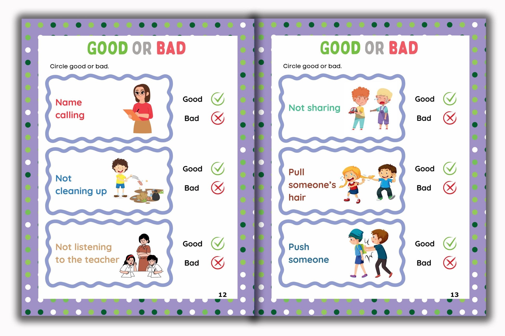 Lastly, Good Or Bad presents scenarios where children must identify positive and negative behaviors. This activity promotes moral understanding and decision-making skills, encouraging children to distinguish between right and wrong in various situations.