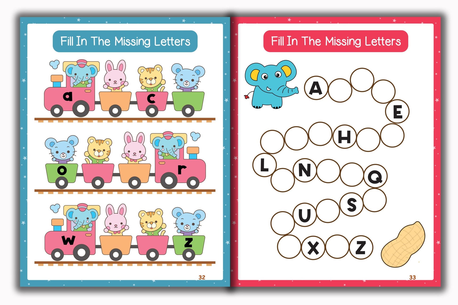 Fill In Missing Letters: This book enhances language skills by encouraging children to complete words with missing letters. Through engaging activities, children will improve their spelling, vocabulary, and understanding of letter patterns, all while having fun.