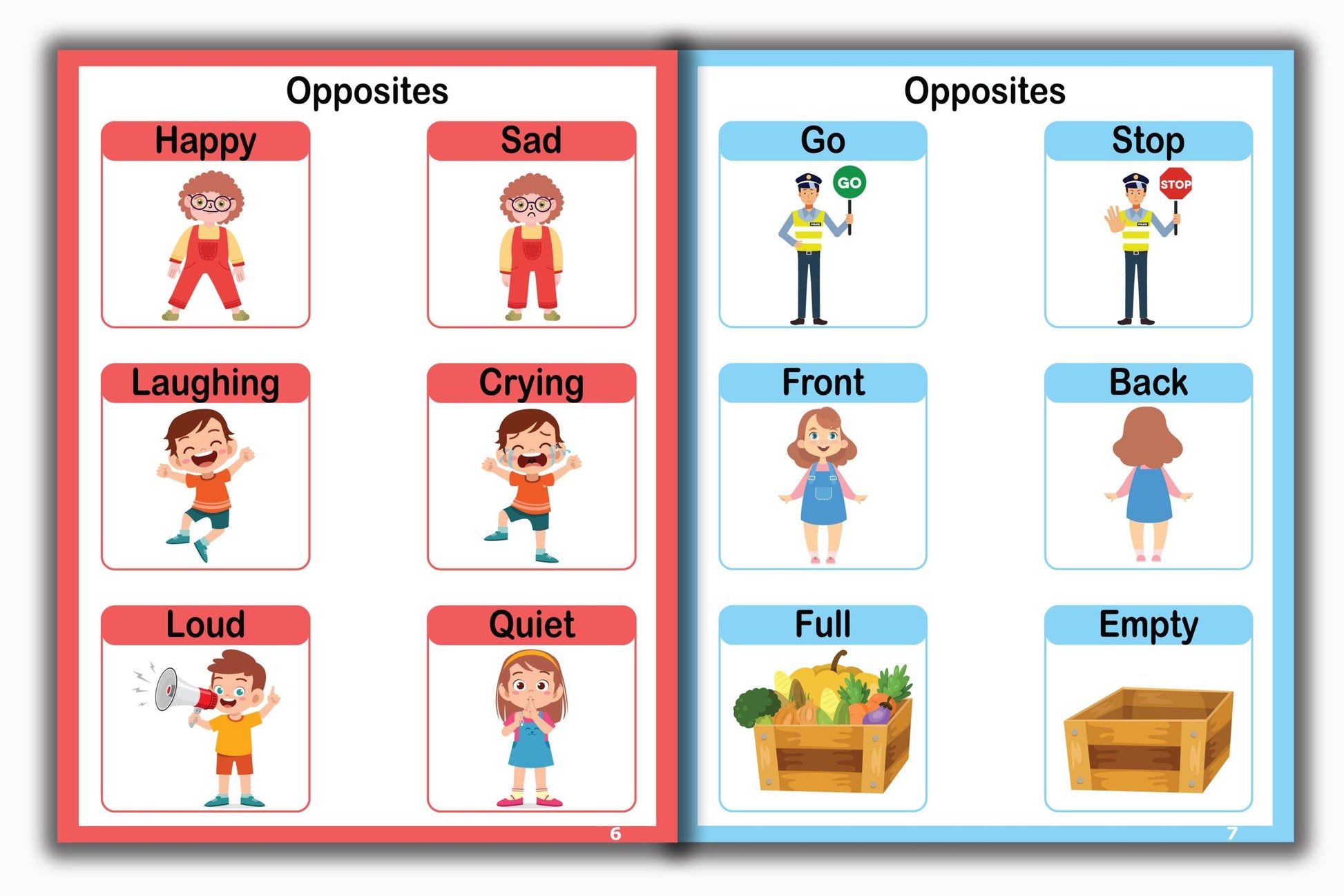 Opposites: Understanding opposites is a key language concept. This book introduces children to pairs of opposites through interactive exercises and colorful illustrations, helping them grasp the meaning of concepts like big and small, fast and slow, and more.