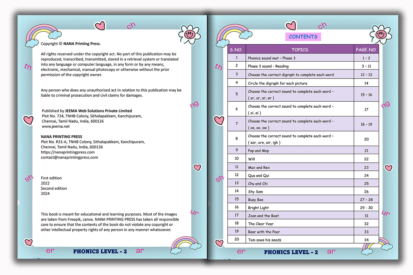 Introducing our Phonics Level 2 Book, a comprehensive resource meticulously designed to enhance young learners' understanding of letter sounds and digraphs. Aligned with US-based phonics standards, this book offers a structured approach to phonics, incorporating interactive exercises and vibrant illustrations to facilitate effective learning.