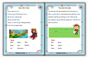 By integrating these elements, the Phonics Level 2 Book provides a holistic learning experience, ensuring that children develop a strong foundation in phonics through a combination of visual aids and interactive practice. This book is an invaluable tool for parents and educators aiming to foster early literacy skills in a fun and engaging manner. It also has short stories for betterment of reading.