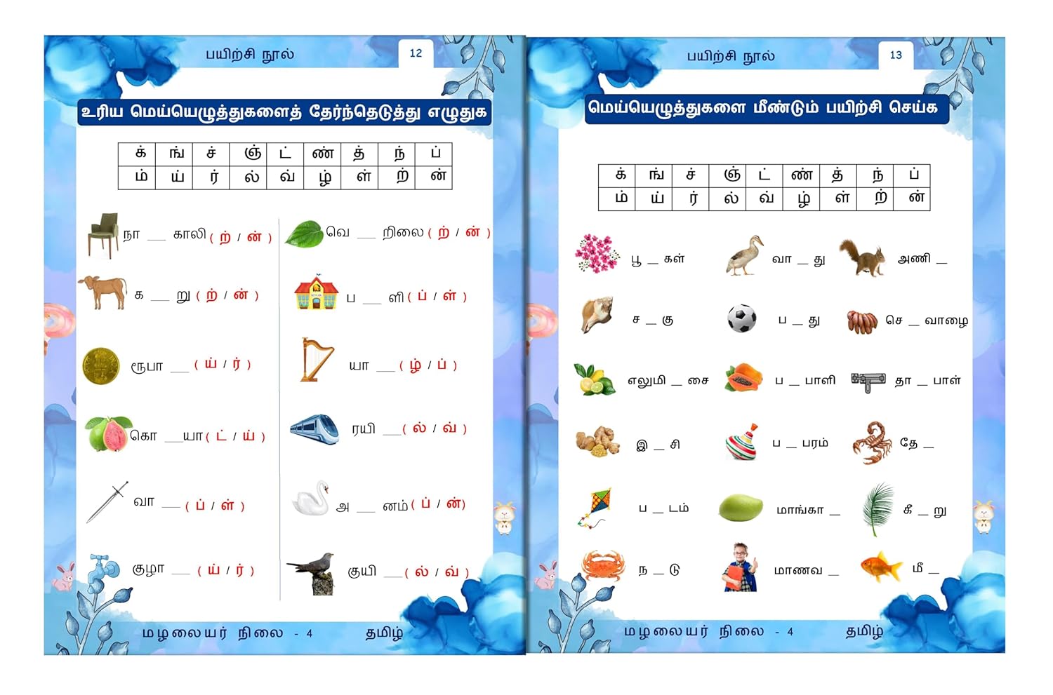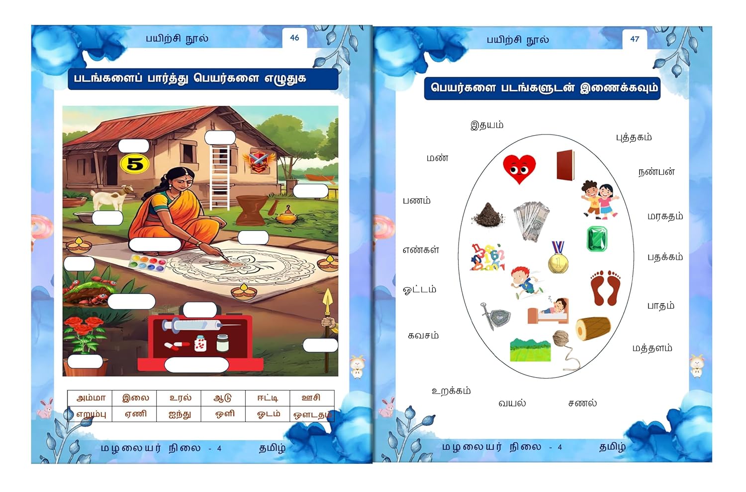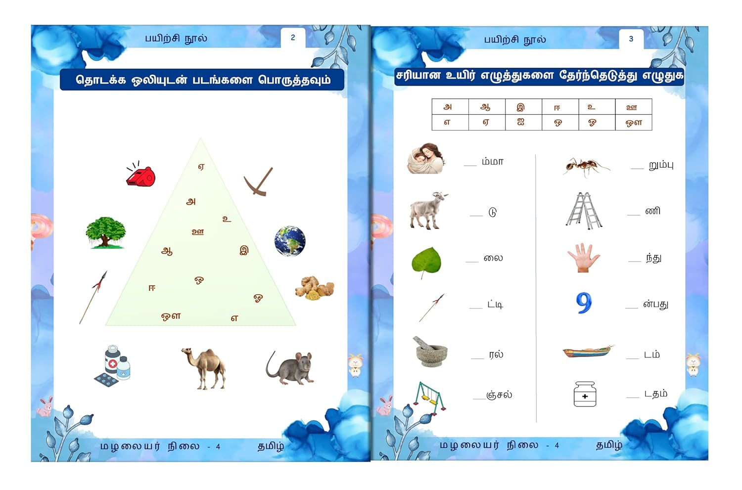 Starting with Uyir Eluthukkal (vowels), Mei Eluthukkal (consonants), and Uyir Mei Eluthukkal (combinations of vowels and consonants), the workbook introduces each concept step by step. The exercises encourage children to identify starting and ending letters of objects using vibrant pictures, making the learning process both exciting and memorable.