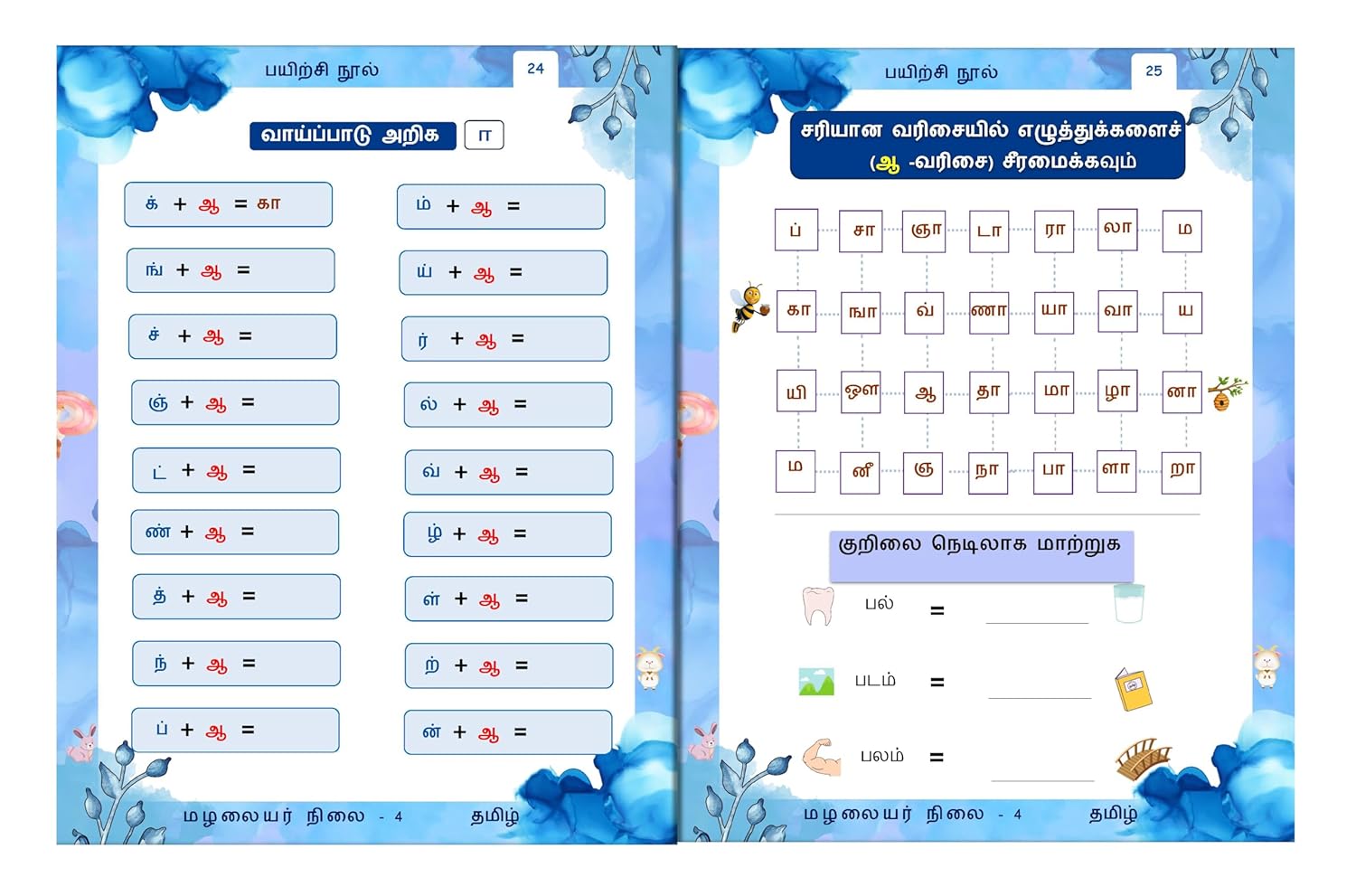 In addition to practicing letter recognition, the workbook includes activities on Kuriyidugal (syllables) to help children understand how to combine letters and form words. Each exercise is designed to build a strong foundation in Tamil reading and writing, ensuring that kids can gradually progress to more complex tasks.