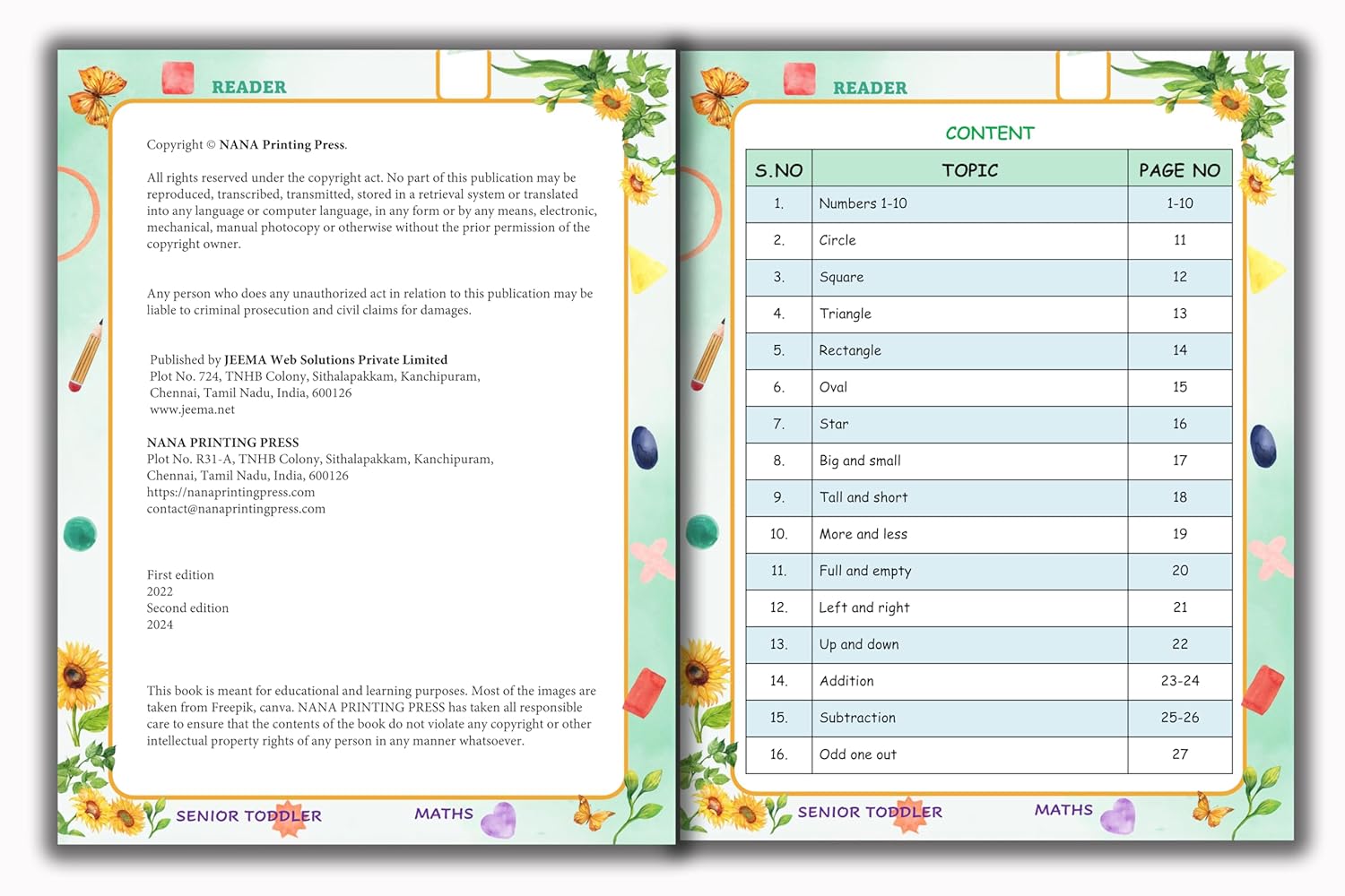 Our Pre-KG Maths Reader is a beautifully designed book that introduces young children to the world of numbers and basic math concepts in a fun, engaging, and visually stimulating way. With colorful illustrations and easy-to-understand content, this book provides a solid foundation for early math skills while making learning enjoyable.